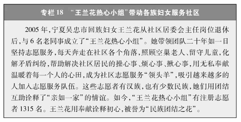 广泛参与平安和谐社区建设。妇女积极参与社会治安综合治理,助力将矛盾纠纷化解在基层。各地积极探索“妇联+”调解模式,截至2024年底,妇联牵头建立3690个县以上婚姻家庭纠纷人民调解委员会,推动婚调组织入驻综治中心、诉讼服务中心、社区警务室,并在村(社区)建设婚调工作室,2016年以来调解近136万件案件。2023年,司法部表彰的999名全国模范人民调解员中女性为295人,占29.5%。妇女积极参与治安巡逻和督导检查,江苏镇江京口区的“江东大妈”工作队自2017年成立以来,累计参与义务巡逻5000小时,参加各类公益活动1000余次;北京市的“西城大妈”、陕西渭南市的“巾帼民情员”等及时发现和报告社会治理隐患,成为化解基层矛盾的前哨。广大妇女活跃在社区工作者、网格员、楼栋长群体中,为建设平安和谐社区发挥重要作用。