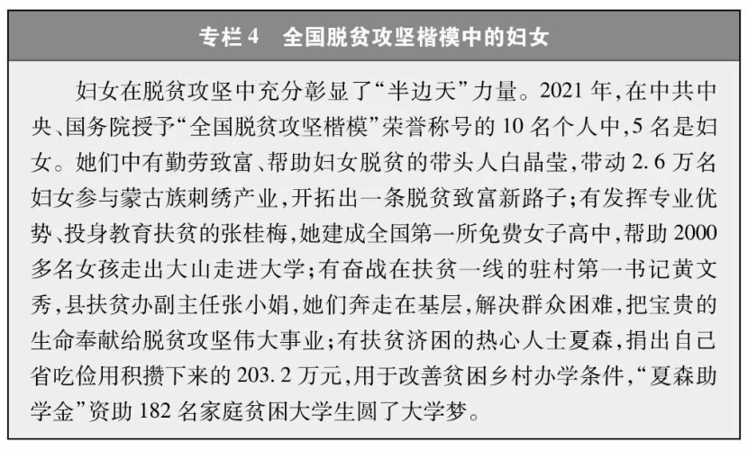 发展生产助力妇女就业增收。坚持开发式扶贫方针,赋能贫困妇女发展。加强产业扶持,推进食品加工、服装制造等劳动密集型产业梯度转移,产业帮扶政策覆盖98.9%的贫困户,通过东西部劳务协作、建立扶贫车间、开发乡村公益性岗位等,为有劳动能力和意愿的贫困妇女提供工作机会;鼓励支持电商扶贫、光伏扶贫、旅游扶贫等新业态新产业发展,帮助贫困妇女实现家门口就业;发展民族地区手工编织产业,让“苗绣”“彝绣”等订单式手工编织从“指尖技艺”转化为“指尖经济”。加强财政和金融支持,脱贫攻坚期间,出台专门政策提供免抵押免担保的贴息贷款、税费减免等支持,累计为妇女发放小额担保贷款和扶贫小额信贷4500多亿元,870万名妇女实现创业增收;2021-2024年,192.8万名妇女持续获得脱贫人口小额信贷768.3亿元。加强能力培训,开展多渠道、多层次、多形式的职业技能培训、创业培训和农业实用技术培训,截至2020年,累计对1021万名贫困妇女和妇女骨干进行各类技能培训;2023-2024年,“雨露计划”共资助63.2万名妇女接受职业教育,妇女发展内生动力持续激发。